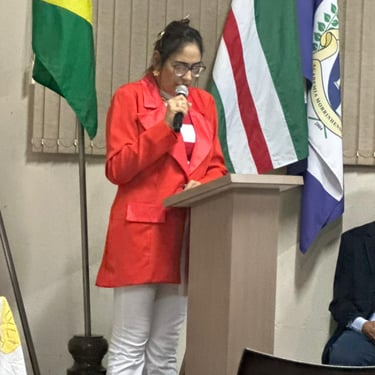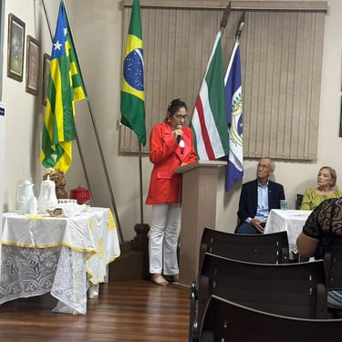 A homenagem à acadêmica Ellen Carneiro Vale foi realizada pela confreira Cleusinha, que ressaltou sua sensibilidade literária, seu compromisso com a cultura e sua contribuição para a Academia Morrinhense de Letras.
